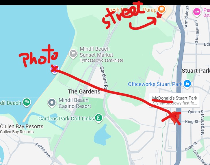 However, the breakthrough came when Grzechu noticed that the major fast-food restaurant name contained the character ᗰ from McDonald's. John Doers found restaurants with McDonald's in that area. Looks identical, right? I rotated it a bit to show the difference, but if you click the link, you'll see that it's the same screenshot from Google Street View and not taken manually with a camera.